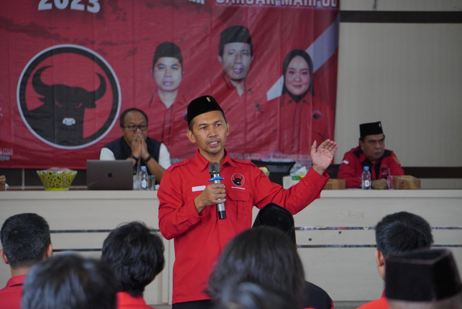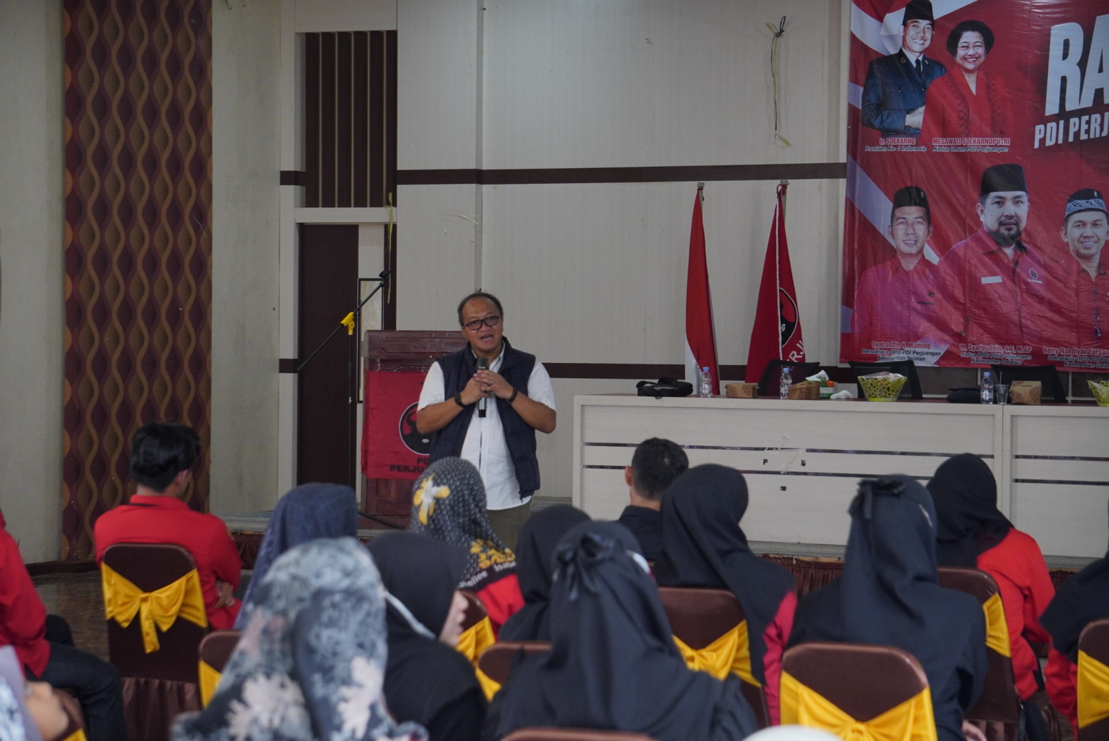 Tekad untuk mengalahkan “Jokowi” di HSU saat di Pilpres 2024 nanti digelorakan Pengajar Sekolah Partai DPP PDI Perjuangan, Ari Junaedi dan Sekretaris DPD PDI Perjuangan, Berry Nahdian Furqon saat acara Rapat Kerja Cabang (Rakercab) PDI Perjuangan Kabupaten HSU di Amuntai, Selasa (26/12/2023).
