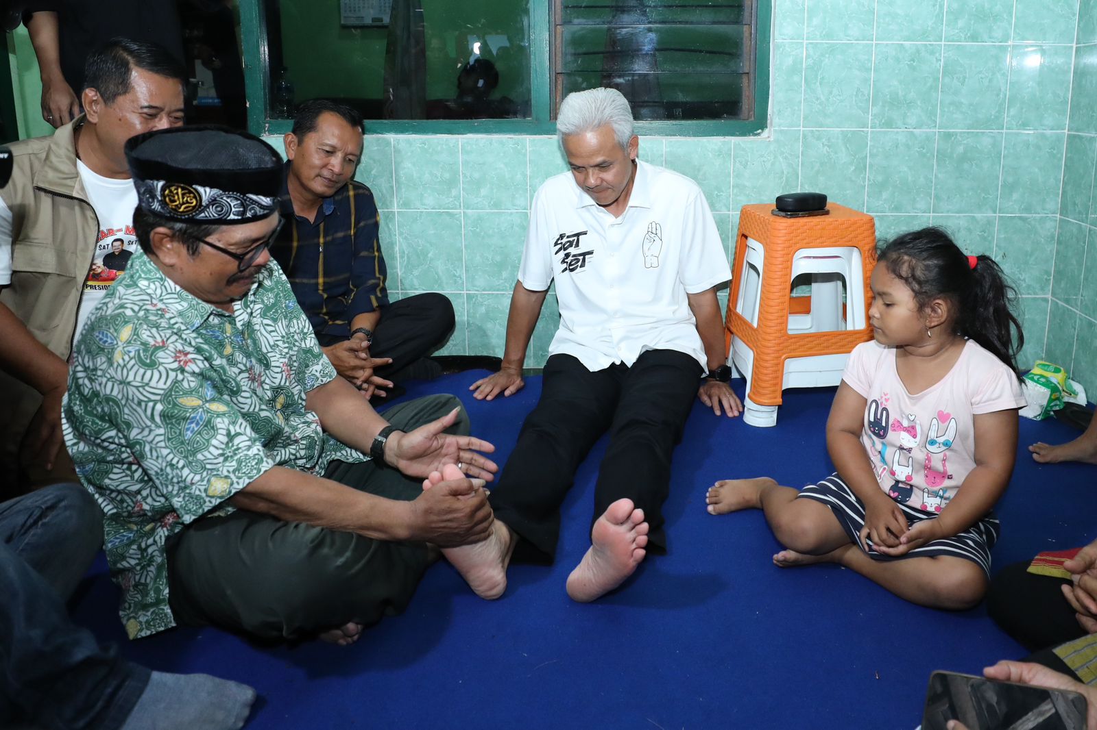 Sebelum masuk ke rumah tersebut, Ganjar menyempatkan duduk lesehan di sebuah tikar dan bercengkerama bersama warga yang telah menunggunya.