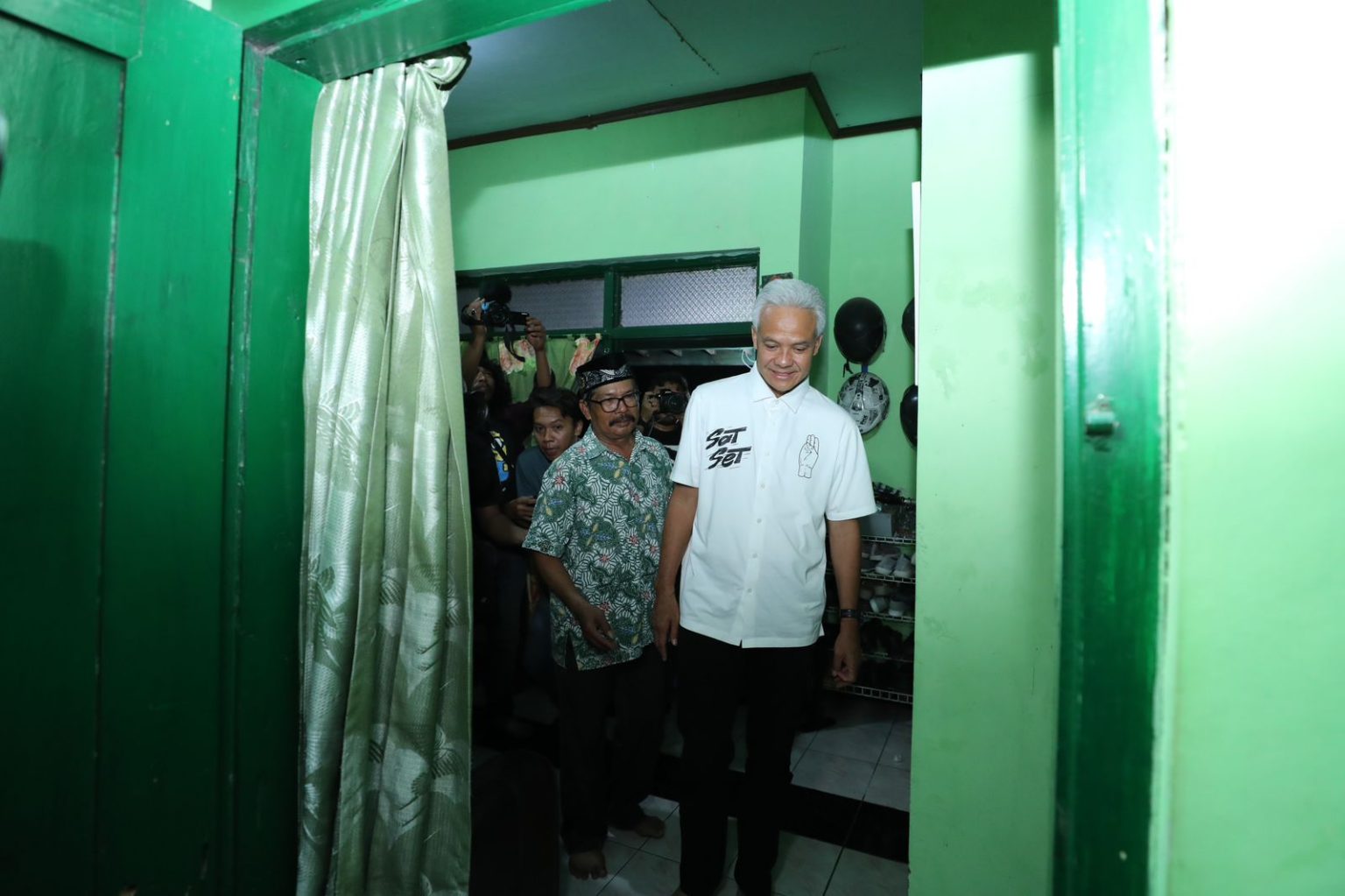 Ganjar yang tiba pada pukul 22.45 WIB itu, terlihat mengenakan kemeja putih dengan tulisan Sat Set.