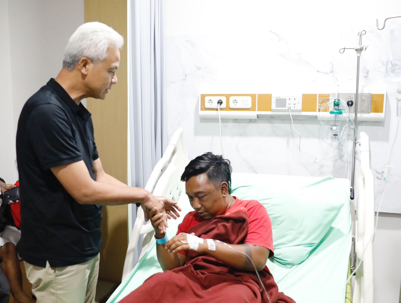 Boyolali-Calon presiden (capres) nomor urut 3, Ganjar Pranowo menjenguk relawan Ganjar-Mahfud yang menjadi korban penganiayaan oleh oknum TNI di Boyolali, Jawa Tengah.