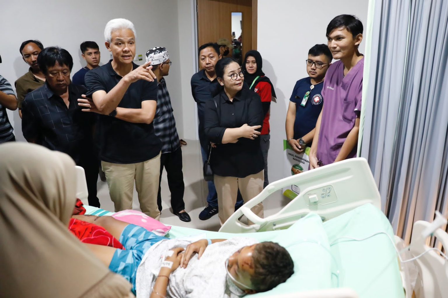 “Iya dari tujuh anak, ada dua yang masih dirawat yaitu Slamet Andono dan Arif Diva Ramandhani. Satu tadi, saya tidak sempat ngomong karena masih tidur. Karena situasinya masing bengkak-bengkak. Yang satu sudah bisa diajak bicara. Hasil pemeriksaan dokter membaik. Bagus. Tidak ada geger otak. Tulangnya bagus. Terus kemudian otaknya juga bagus, hanya memar-memar saja. Satu patah gigi. Itu kondisinya,” ungkap Ganjar di RSUD Pandan Arang, Boyolali, Jawa Tengah, Minggu malam (31/12/2023).