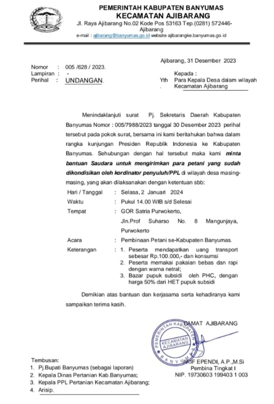 Surat itu menyebut, para petani yang datang dalam acara bertajuk ‘Pembinaan Petani se-Kabupaten Banyumas’ di GOR Satria akan mendapat uang transport sebesar Rp 100 ribu dan konsumsi. Selain itu, peserta akan mengikuti bazar pupuk subsidi dengan harga 50 persen dari Harga Eceran Tertinggi pupuk subsidi. Surat yang dibuat pada 31 Desember 2023 itu ditandatangani Camat Ajibarang Arif Ependi.
