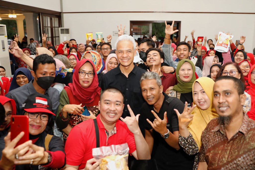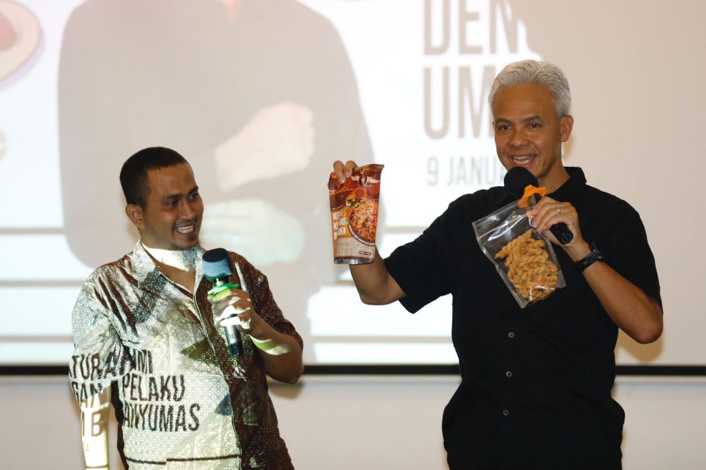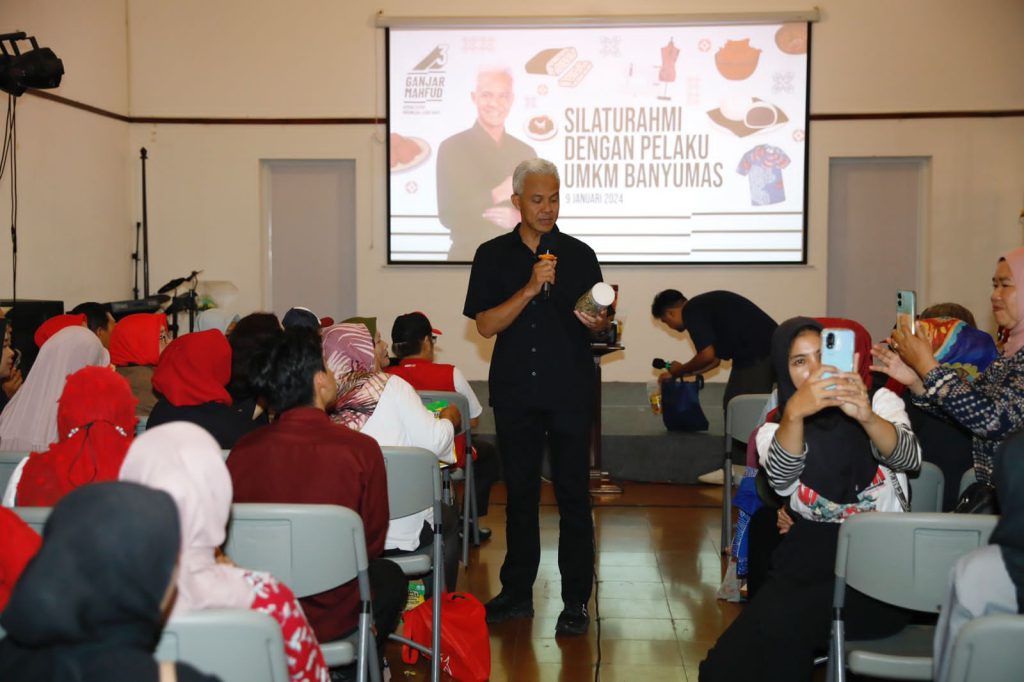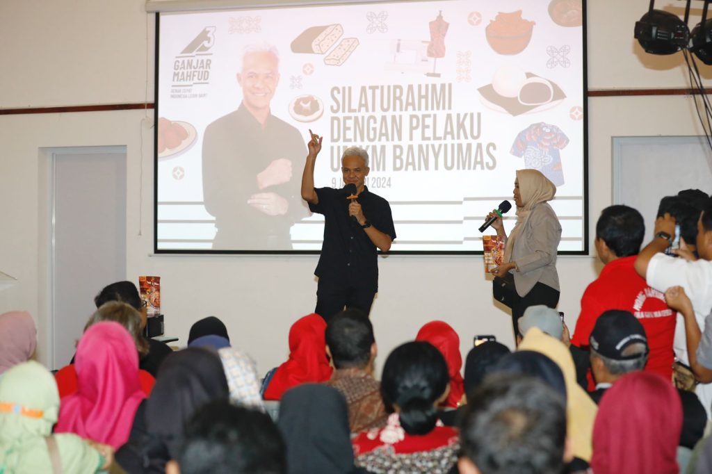 Banyumas – Calon Presiden nomor urut tiga, Ganjar Pranowo bertemu dengan pelaku usaha mikro kecil menengah (UMKM) Banyumas di Hetero Space, Banyumas, Jawa Tengah, Selasa (9/1/2024). Ganjar pun berdialog dengan para pelaku UMKM.