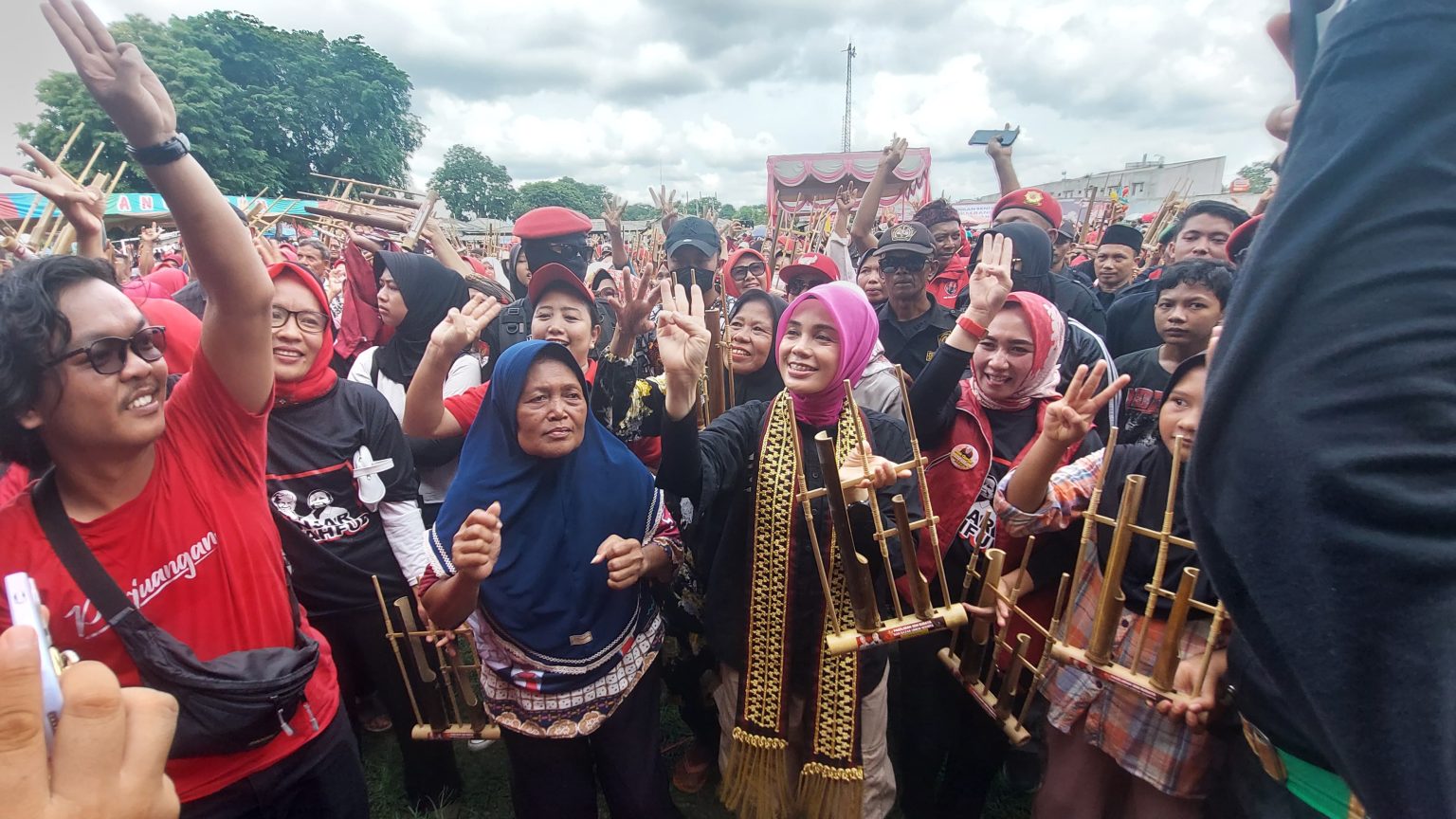 Kota Gajah – Istri capres nomor urut 3 Ganjar Pranowo, Siti Atikoh Suprianti memainkan angklung bersama ribuan warga di Lapangan Merdeka Kotagajah, Kota Gajah, Kec. Kota Gajah, Kabupaten Lampung Tengah, Lampung, Rabu (10/1/2024).
