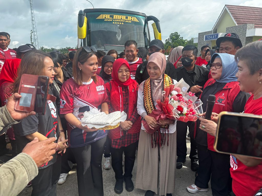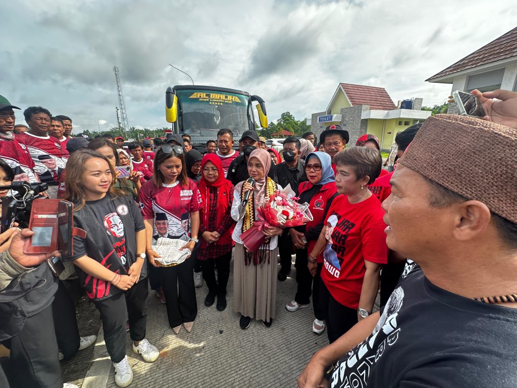 Pantauan di lokasi, Atikoh disambut antusias para sukarelawan setibanya di Rest area KM 234. Mereka pun tampak membentangkan spanduk penyambutan untuk Atikoh.