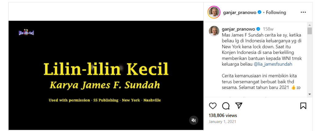New York – James F Sundah, pencipta lagu Lilin-Lilin Kecil yang terkenal, menyatakan dukungannya kepada Calon Presiden (Capres) dan Calon Wakil Presiden (Cawapres) Nomor Urut 3, Ganjar Pranowo dan Mahfud MD (Ganjar-Mahfud).