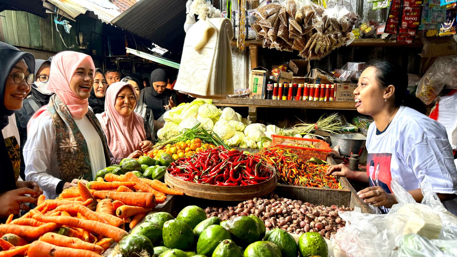 “Rp 22 ribu bawang merah naik Rp 2 ribu Bu. Rp 32 ribu bawang putih, Rp 20 ribu cabai,” keluh pedagang kepada Atikoh.