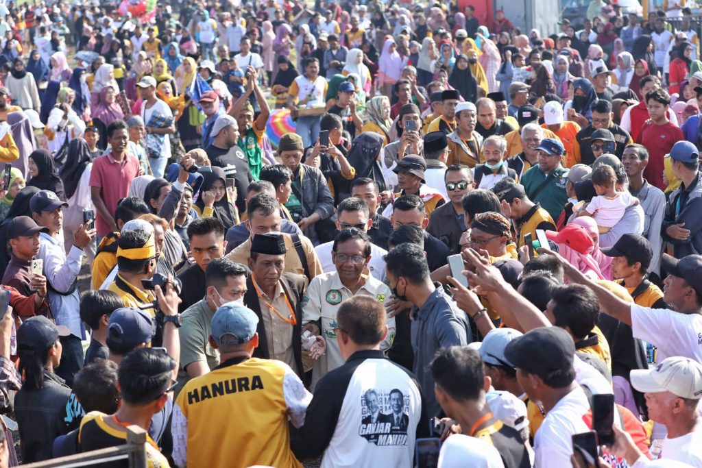 Pasuruan- Calon Wakil Presiden (Cawapres) nomor urut 3, Mahfud MD menghadiri acara Funwalk bersama ribuan kader Partai Hati Nurani Rakyat (Hanura) di Pondok Pesantren Metal, Jalan Raya Pantura, Palembon, Sambirejo, Rejoso, Pasuruan, Jawa Timur.