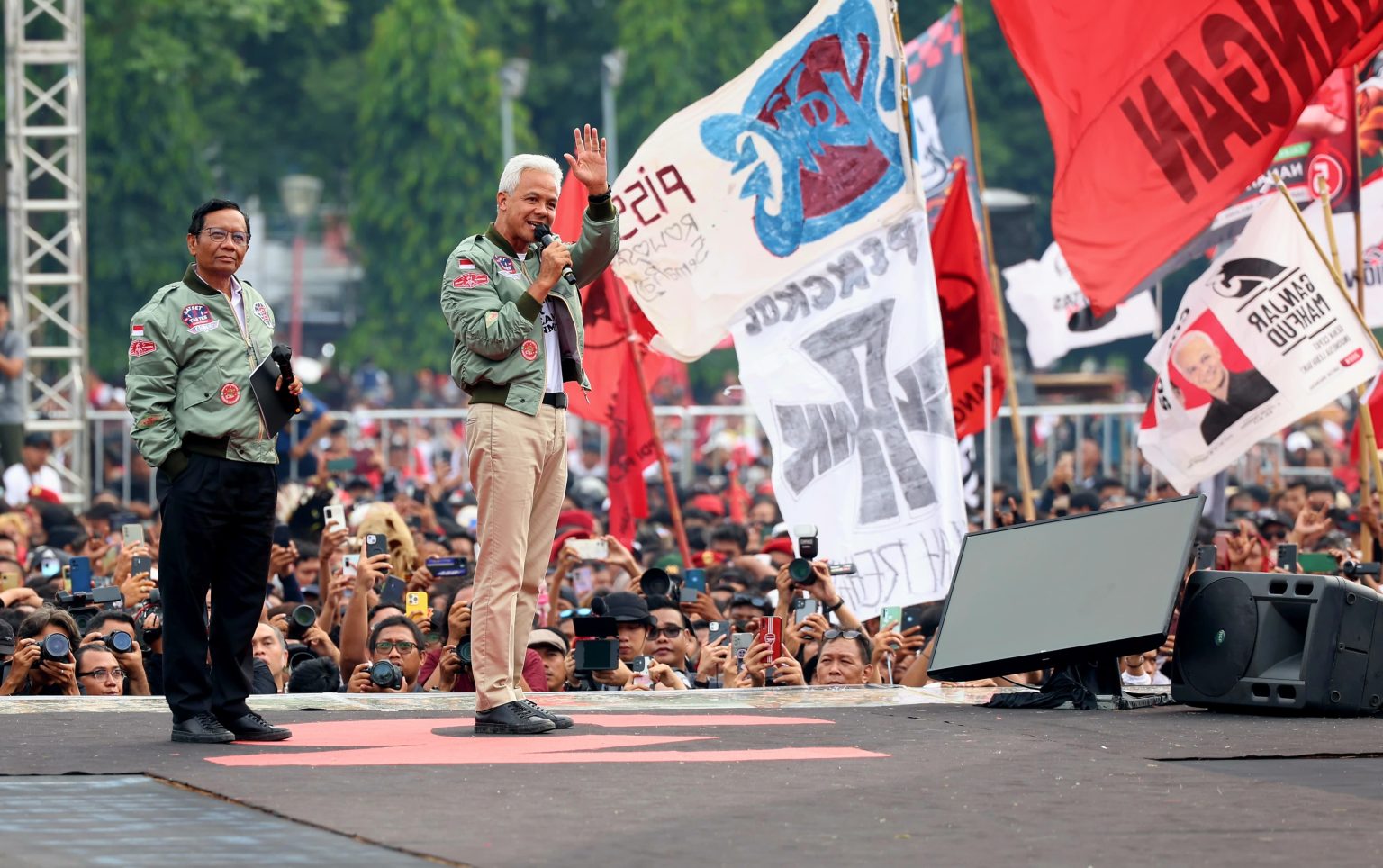 Semarang – Calon presiden nomor urut 3, Ganjar Pranowo, mengajak para pendukungnya untuk hending sejenak, untuk berdoa, ketika hendak mengawali orasi politiknya pada kampanye akbar bertajuk Hajatan Rakyat di Lapangan Simpang Lima, Semarang, Jawa Tengah, Sabtu (10/2/2024).