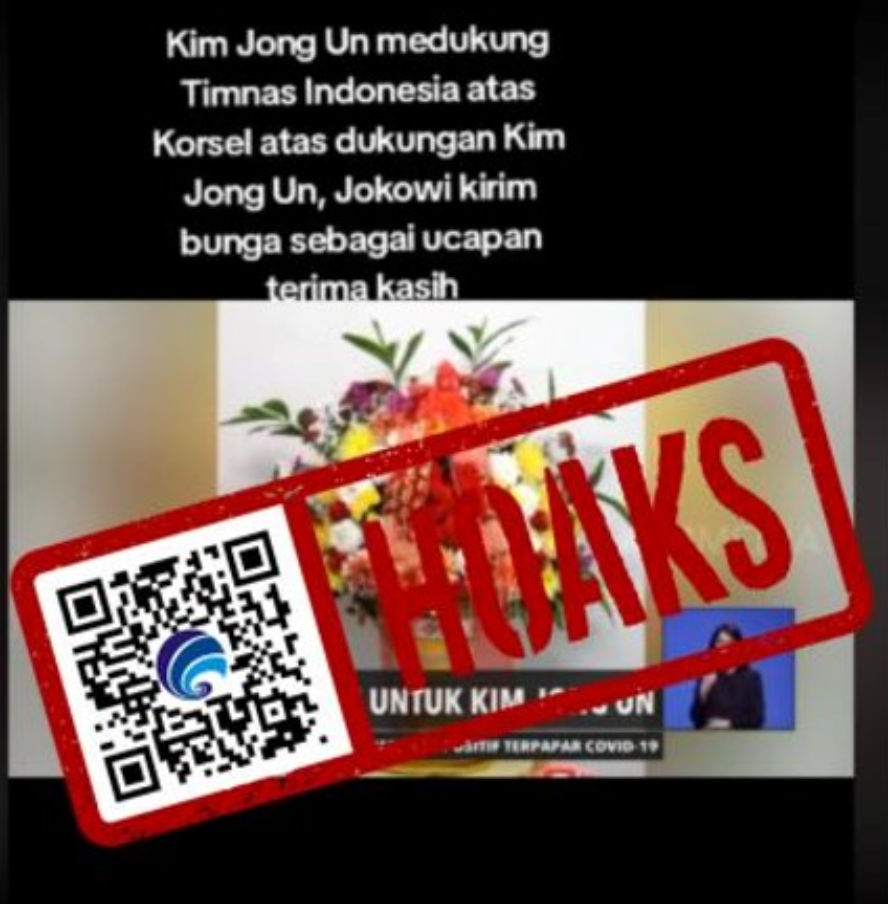 Jakarta – Beredar sebuah unggahan video di platform TikTok berisi narasi yang mengeklaim Presiden Indonesia, Joko Widodo (Jokowi) mengirim bunga ke Presiden Korea Utara, Kim Jong Un sebagai ucapan terima kasih atas dukungannya terhadap tim nasional Indonesia di Piala Asia U23 saat melawan Korea Selatan.
