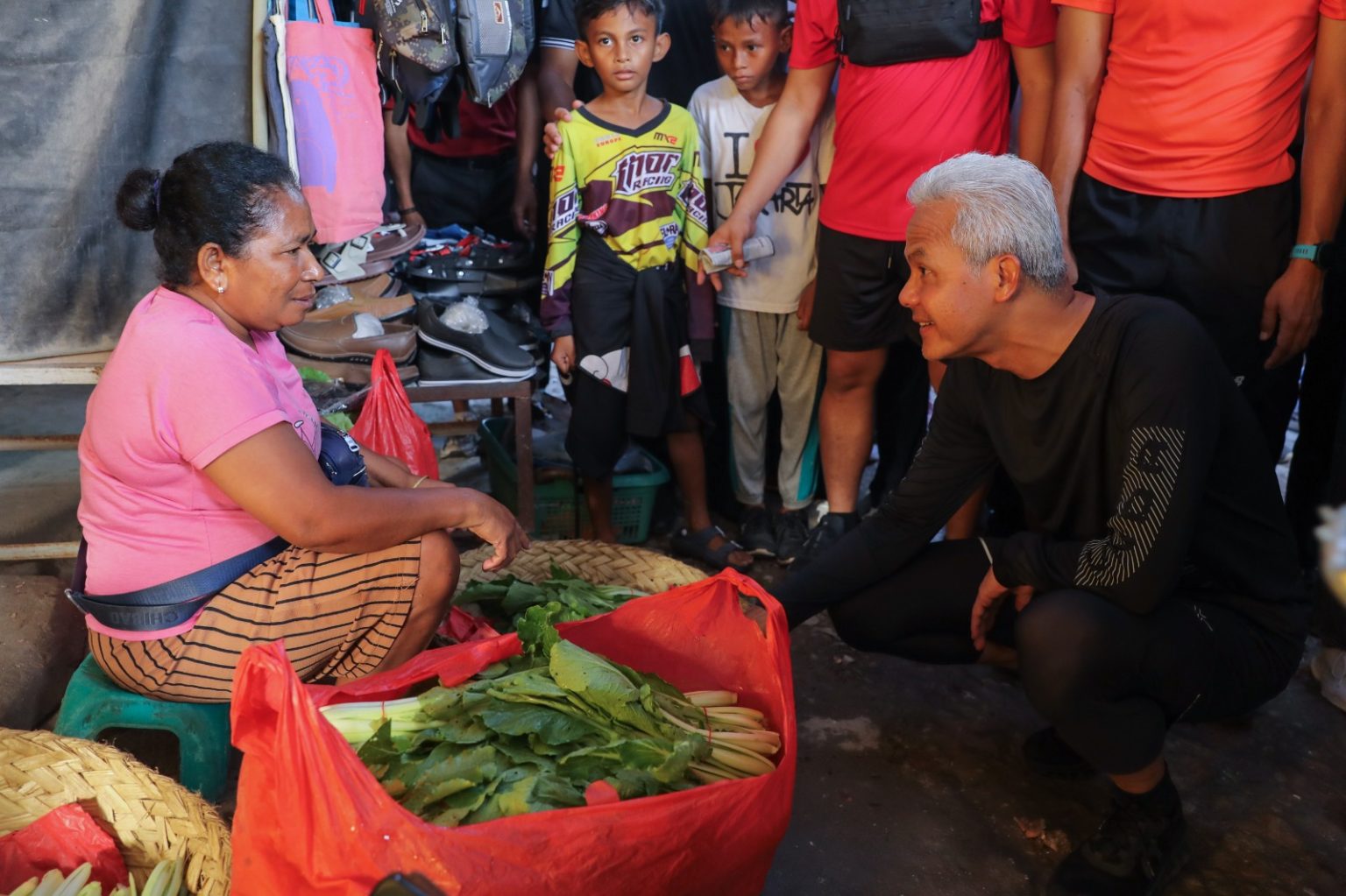 Kupang – Ganjar Pranowo, Capres 2024 nomor urut 3 menikmati pagi di Kota Kupang, Nusa Tenggara Timur (NTT) dengan menyapa warga di acara Car Free Day, Sabtu (2/12/2023). Dalam kesempatan itu, ia menyempatkan diri untuk blusukan ke Pasar Inpres Naikoten I.