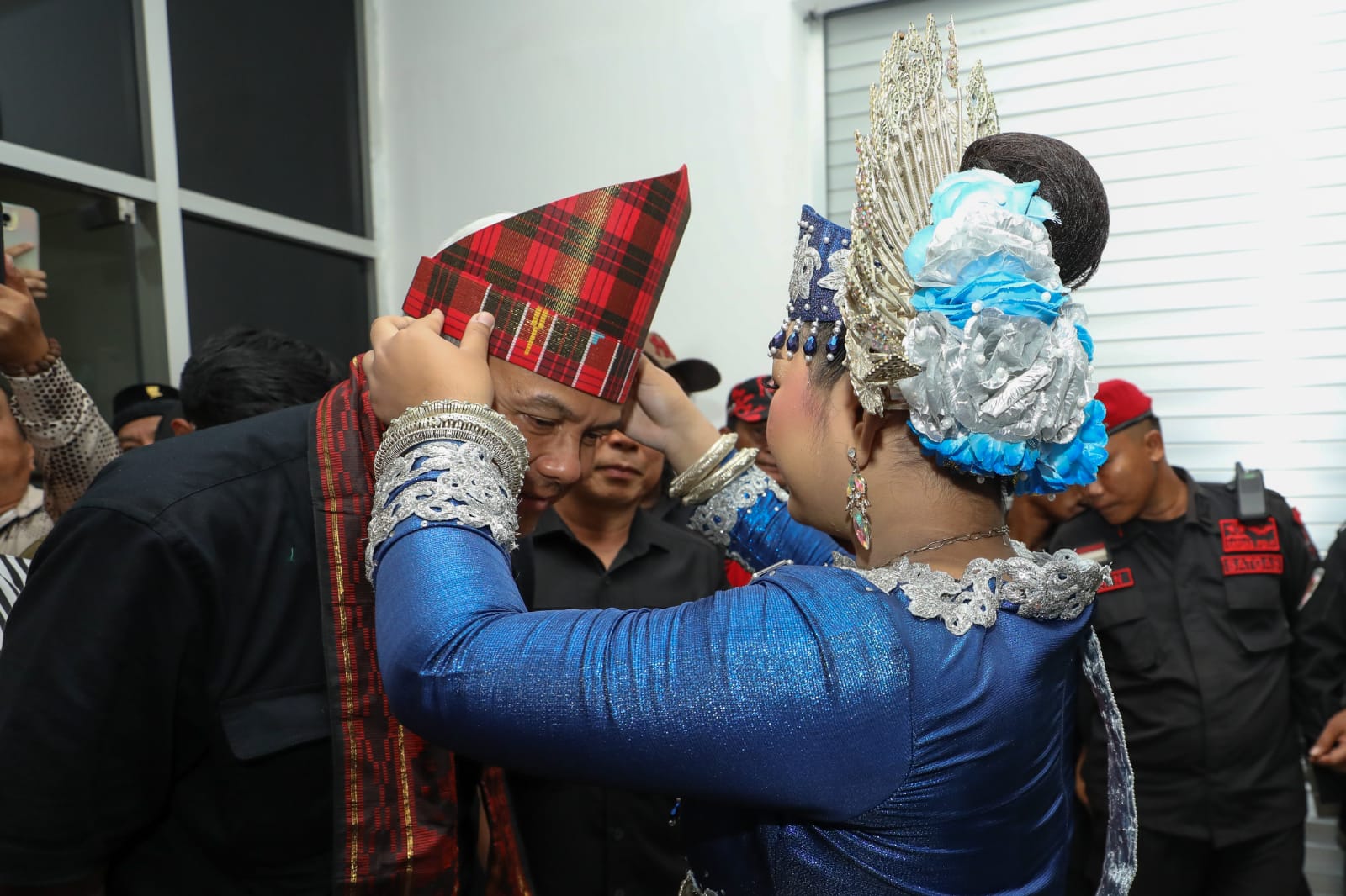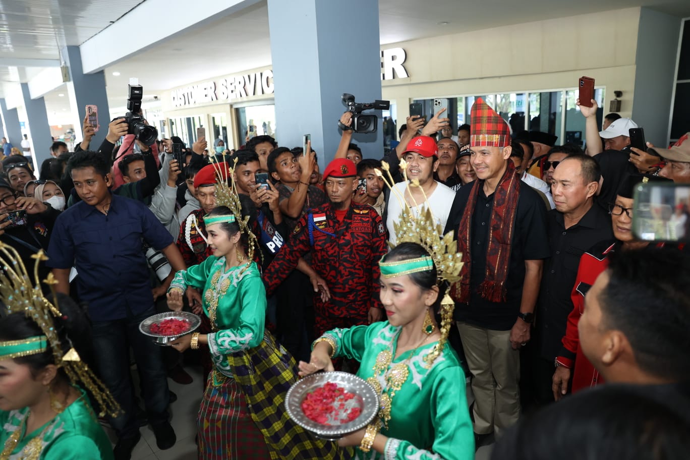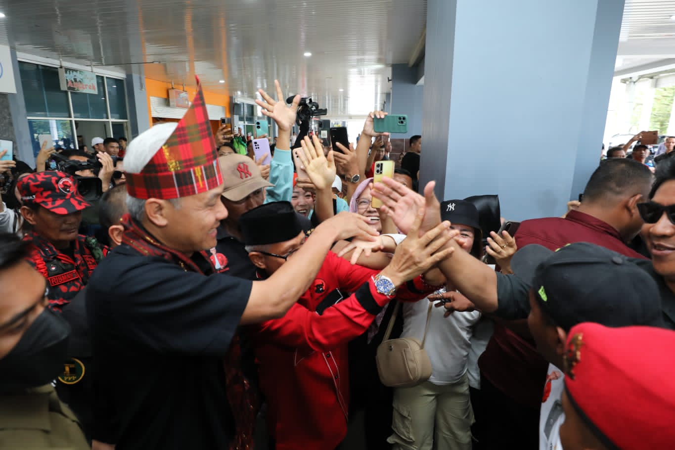 Mereka kemudian memberikan pabele dan selempang putih kepada calon presiden (capres) 2024 nomor urut 3 itu. Warga yang turut menyambut kedatangan Ganjar, tak ingin kehilangan momen itu. Mereka berebut tempat untuk bisa mengabadikan lewat kamera handphone. Sebagian warga ada juga yang meminta bersalaman dengan Ganjar.