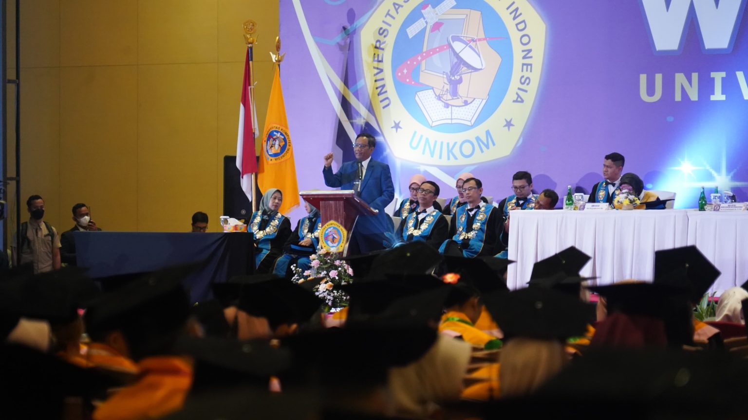 Bandung – Calon Wakil Presiden (Cawapres) nomor urut 3 sekaligus Menko Polhukam Mahfud MD orasi ilmiah di hadapan ratusan mahasiswa pasa Sidang Terbuka Senat Wisuda Ke-40 Universitas Komputer Indonesia (Unikom), Hotel Harris, Bandung, Jawa Barat, Sabtu (9/12/2023).
